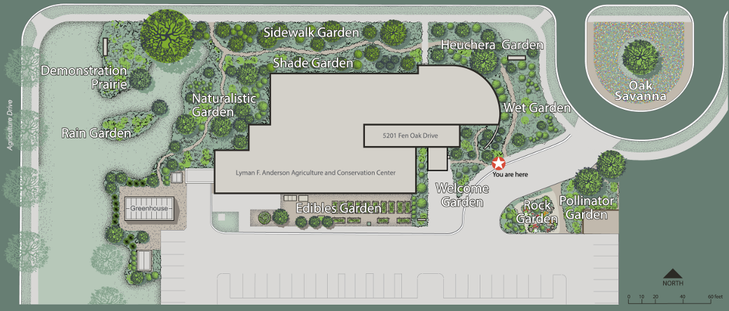 The garden beds are maintained by Dane County Extension Horticulture Volunteers under the guidance of the Dane County Extension Horticulture Outreach Specialist. The Teaching Garden surrounds the Dane County Extension Office at 5201 Fen Oak Drive in Madison, Wisconsin.